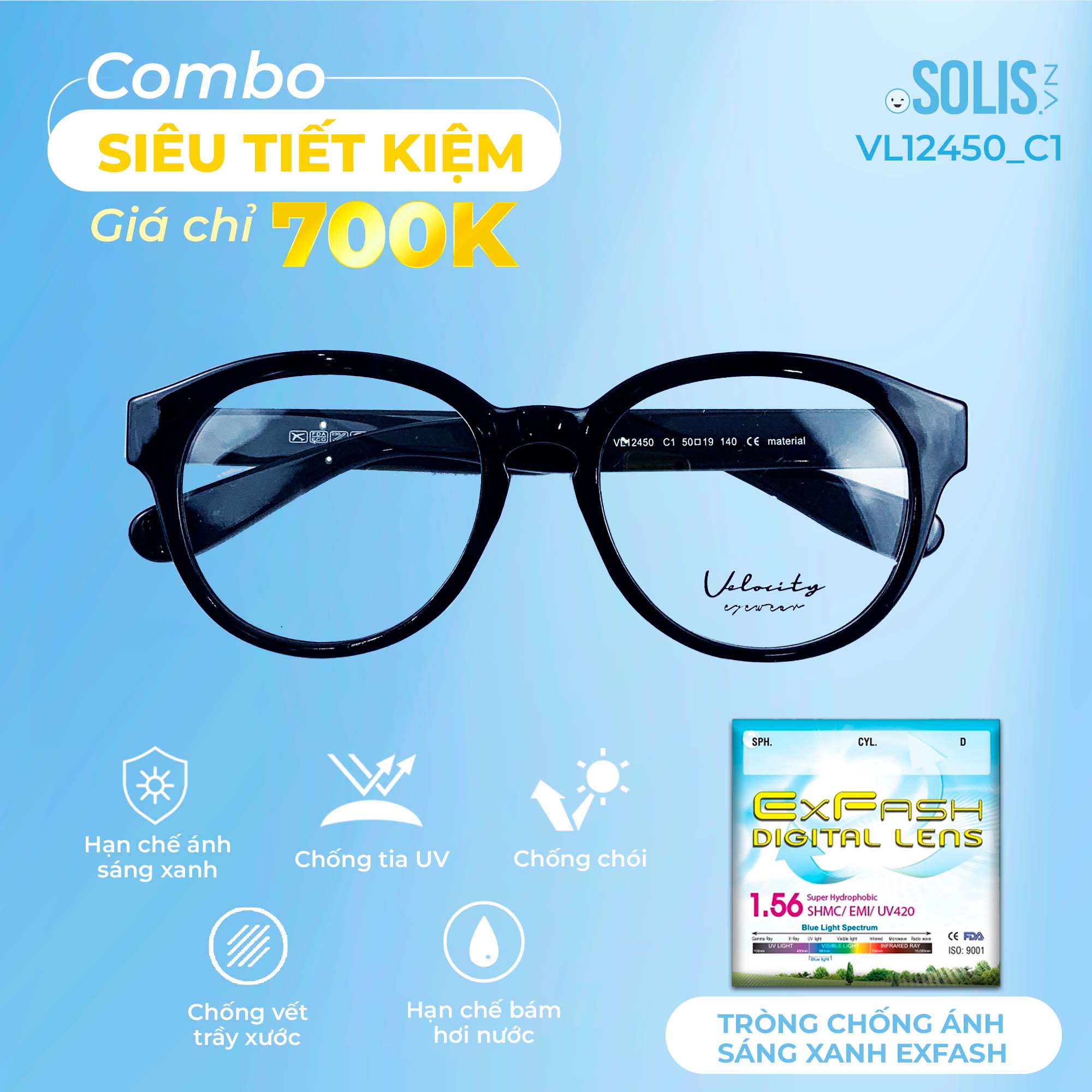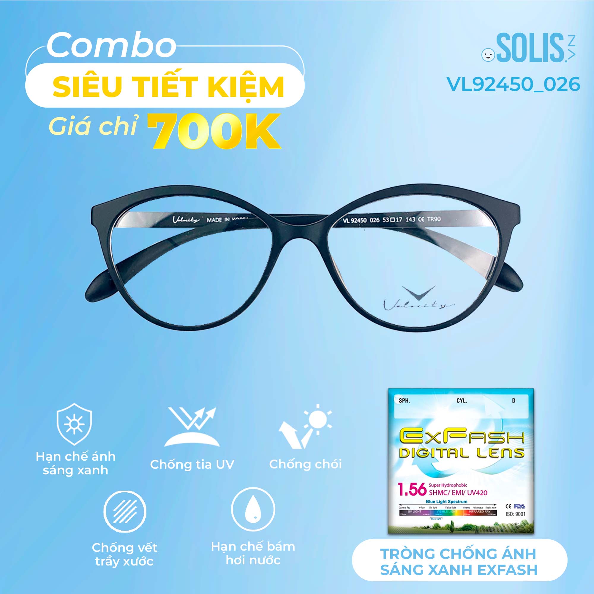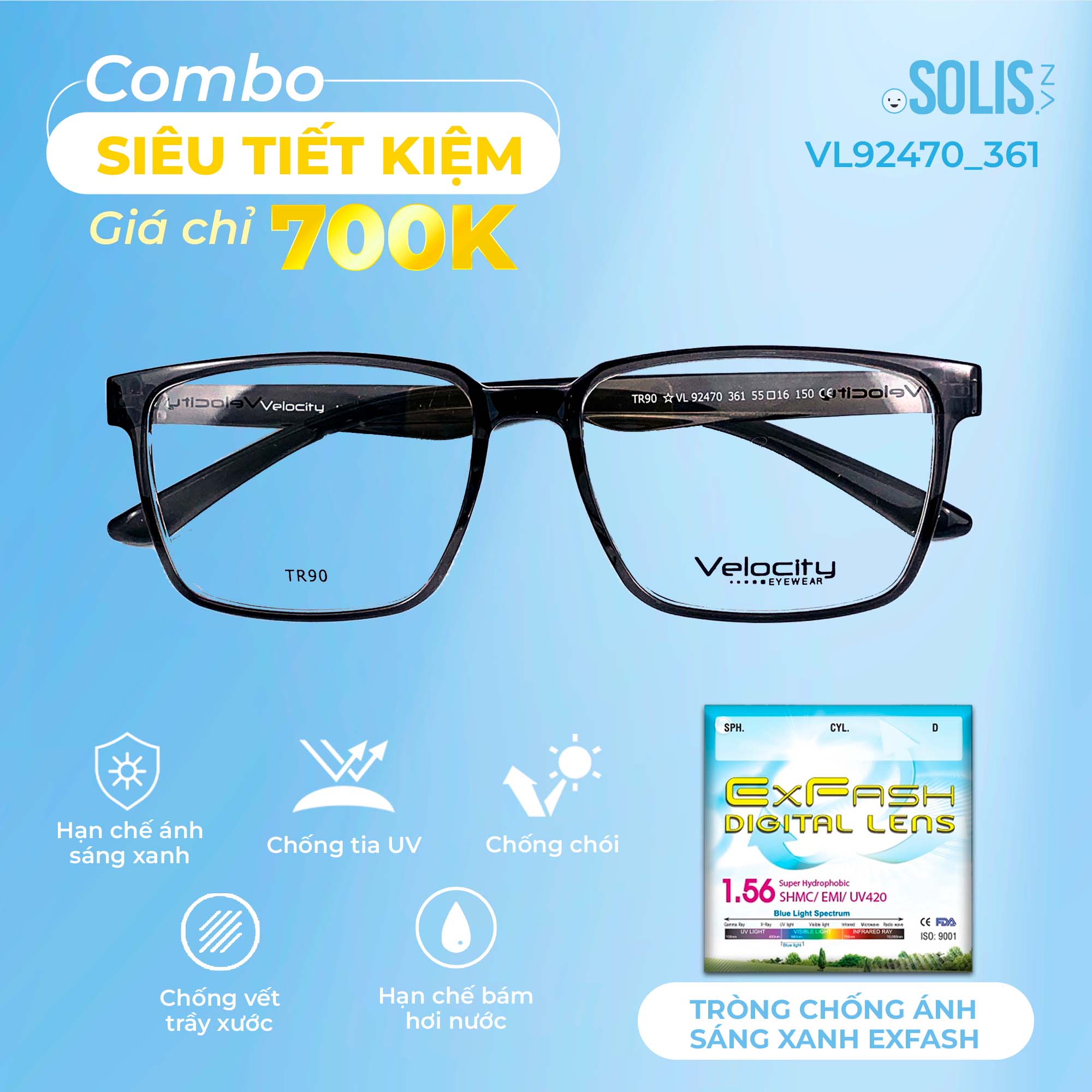 ✨ Combo 700K: Tròng chống ánh sáng xanh Exfash + Gọng kính nhựa Velocity
